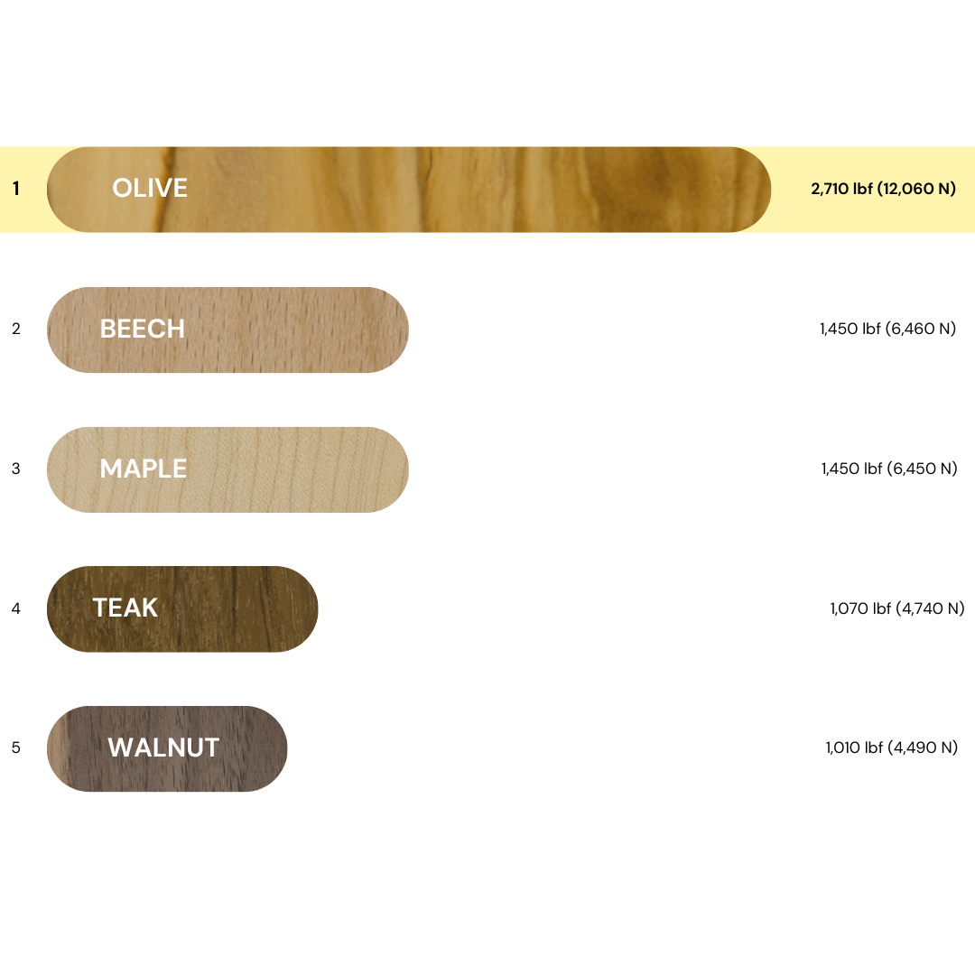 With a hardness rating of 2,710 lbf (12,060 N), olive wood stands well above beech (1,450), maple (1,450), teak (1,070), and walnut (1,010).